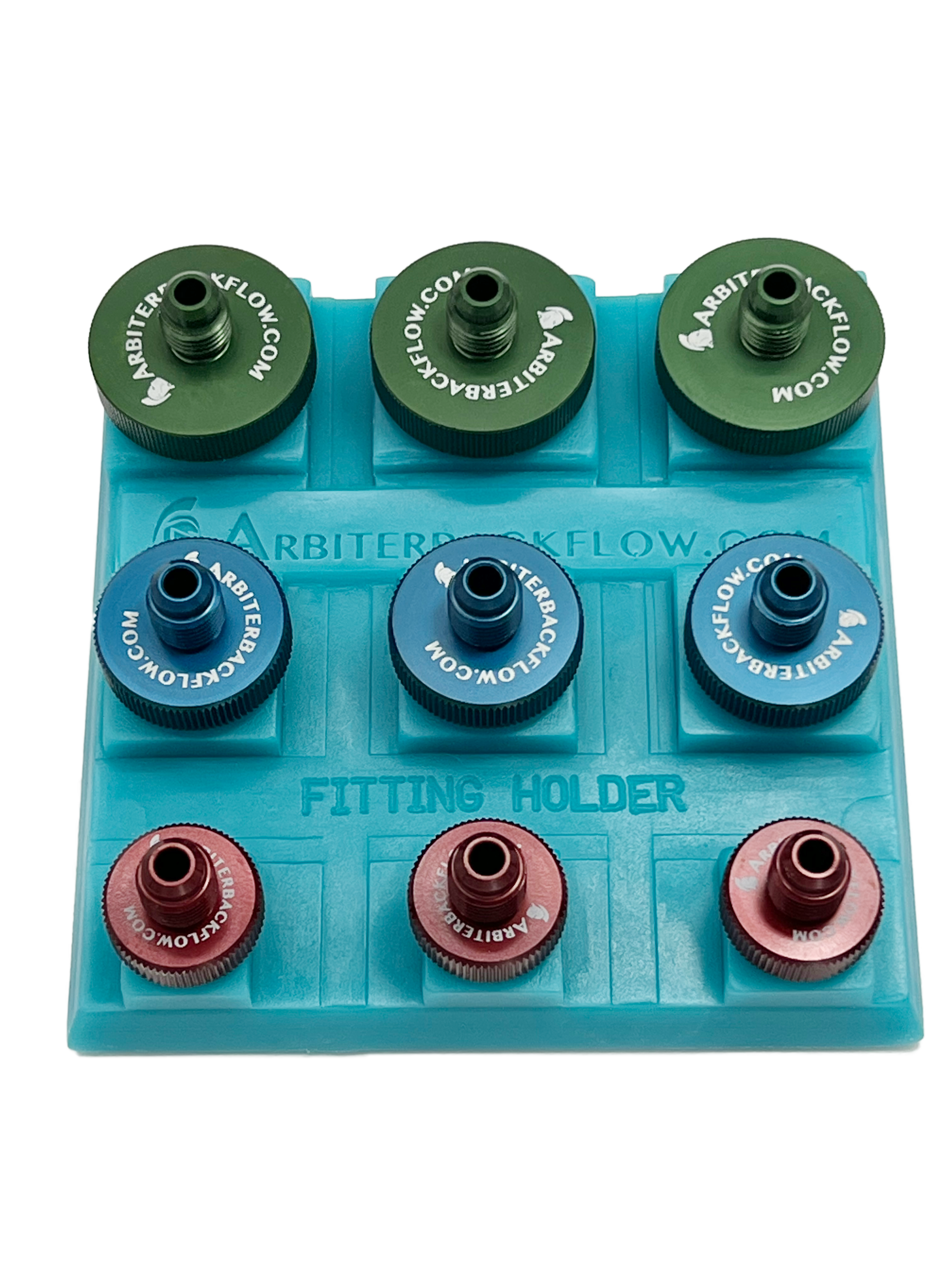 QT 200A ANODIZED ALUM TEST FITTINGS 3 OF EACH SIZE 1/4″ 1/2″ & 3/4″ IN HOLDER